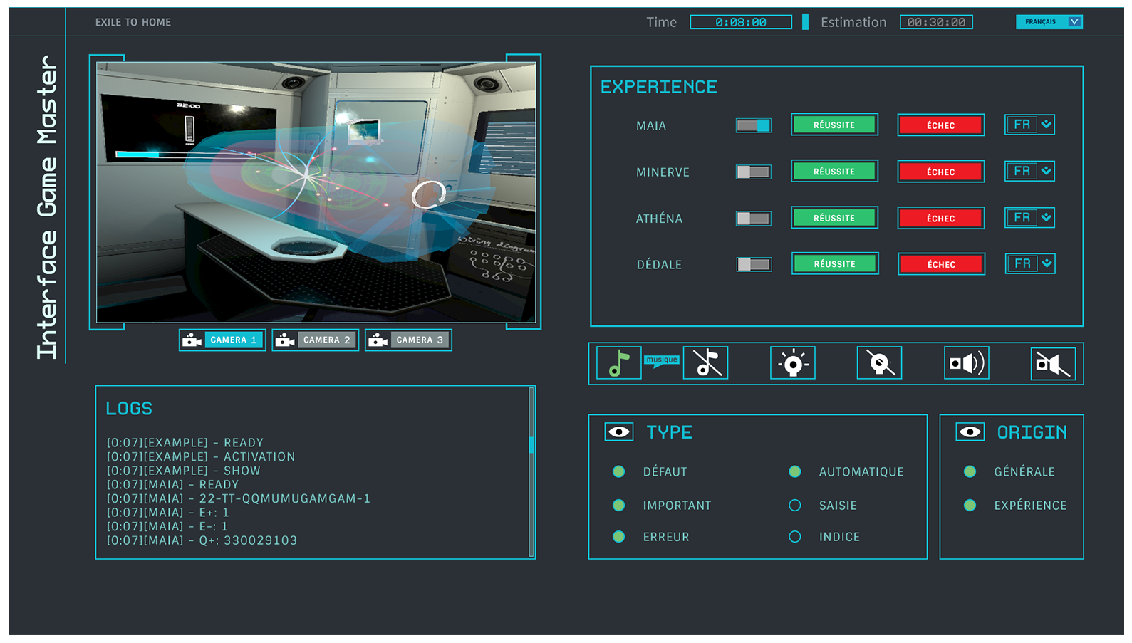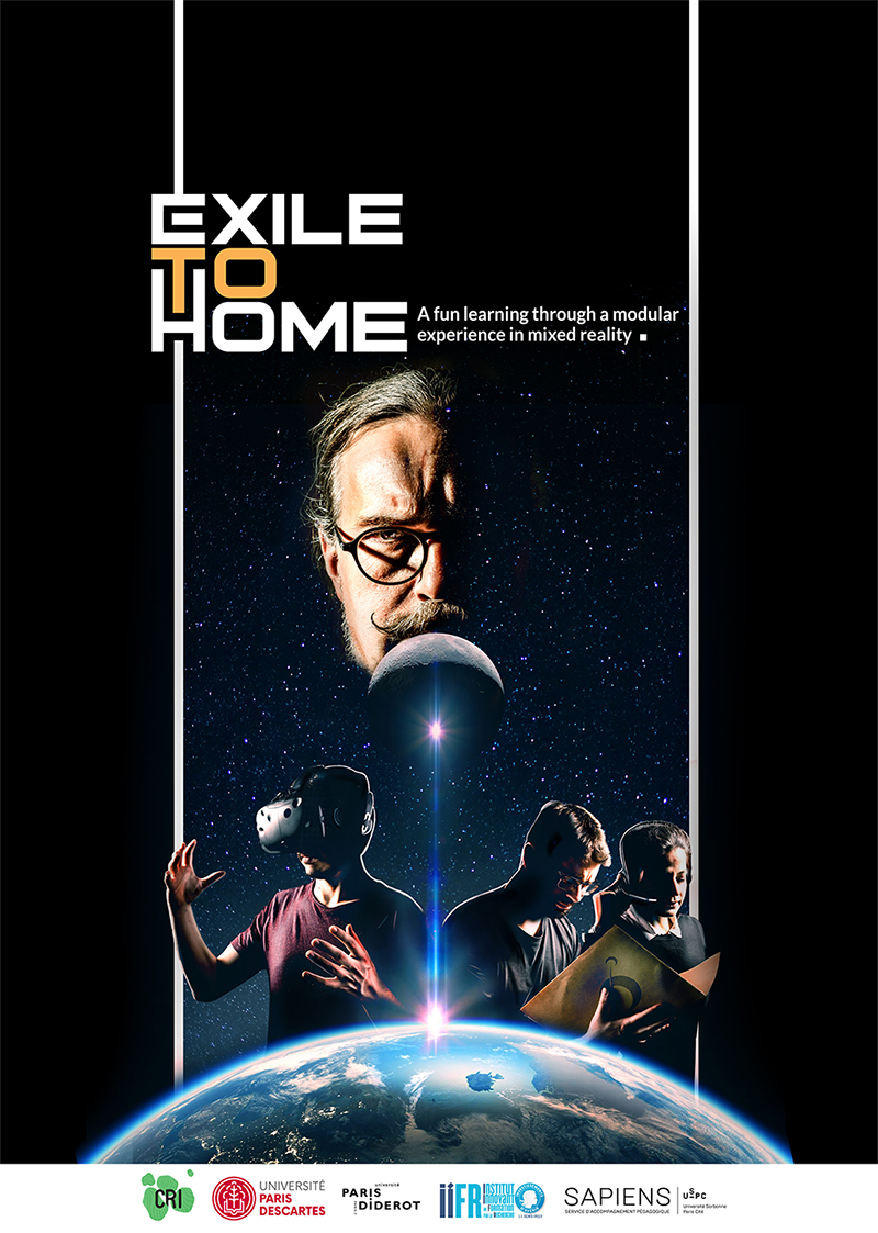 Exile to Home is a collective mixed reality game to learn through strong narratives and game mechanisms science and risks management. Players in a control room with real assets interacts with other players in augmented virtuality VR. All part of the game (size, technology, content…) is highly modular to fit the needs of gamemasters, teachers and researchers. In this asymetric game, they all have to fix the unstable scientific experiments in a lunar base to save the future of Earth!